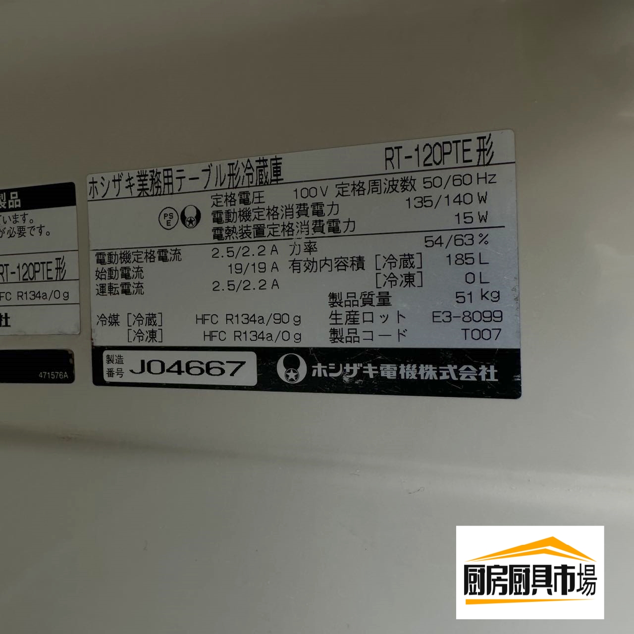 【中古品】番号244◆ホシザキ 台下冷蔵庫 RT-120PTE 2009年 幅1200×奥行450×高さ800 動作問題なし☆ 【商品の説明】 ■メーカー:ホシザキ ■型式:PT-120PTE ■年式:2009年 ■定格電圧:100v ■定格周波数:50/60Hz ■電動機定格消費電力:135/140W ■電熱装置定格消費電力:15W ■電動機定格電流:2.5/2.2A ■始動電流:19/19A ■運転電流:2.5/2.2A ■力率:54/63% ■冷媒:冷蔵 HFC R134a/90g 冷凍 HFC R134a/0g ■有効内容積:冷蔵 185L 冷凍 0L ■製品質量:51kg ■使用状況:中古品、動作確認OK ■中古品につき多少の汚れ・キズ・凹み等はあります。 |